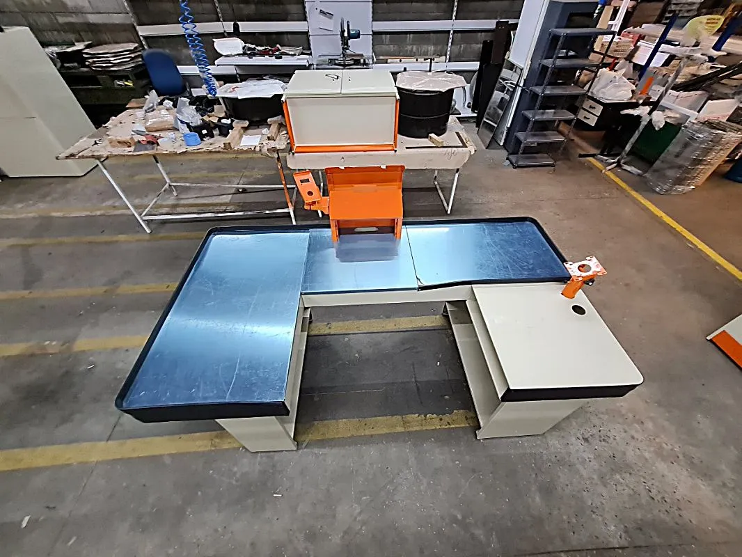 Isso inclui esteira rolante com sensor de presença, monitor e sistema de leitura de código de barras, balança integrada para pesagem de produtos, gaveta de dinheiro com compartimentos organizados, CPU e acessórios para o operador.